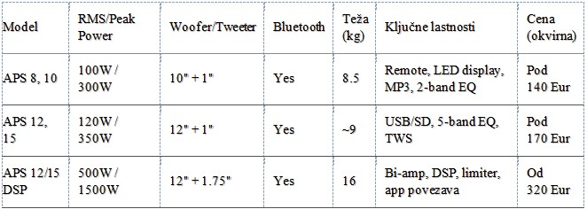 Serija APS pokriva vse te potrebe. Že od modela APS 8 naprej vsi sistemi vključujejo Bluetooth, TWS (brezžično stereo povezovanje) in daljinski upravljalnik. Modeli brez DSP procesorja omogočajo preprosto uporabo, medtem ko DSP različice (kot APS 12 DSP in APS 15 DSP) ponujajo napredne EQ nastavitve, shranjevanje prednastavitev in deljenje datotek – idealno za izkušene uporabnike.